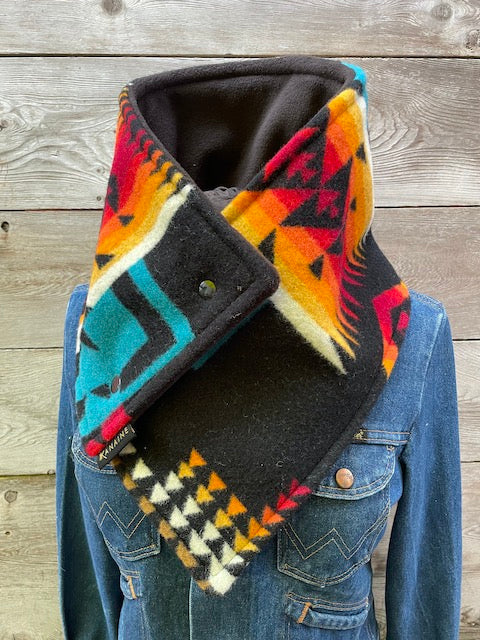 This one-of-a-kind buckaroo cowl is handmade from authentic Pendleton wool blanket in the Chief Joseph design. Each buckaroo comes fully lined with super warm luxe fleece or faux sherpa and finished with two heavy western snaps.
