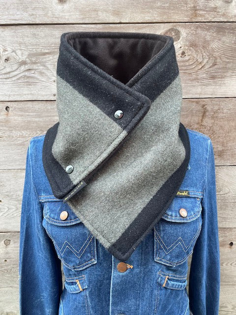 This season's buckaroo cowl is handmade from authentic Pendleton wool blanket in rustic greens and espresso from the pioneer collection. Each buckaroo comes fully lined with super warm luxe fleece or faux sherpa and finished with two heavy western snaps.