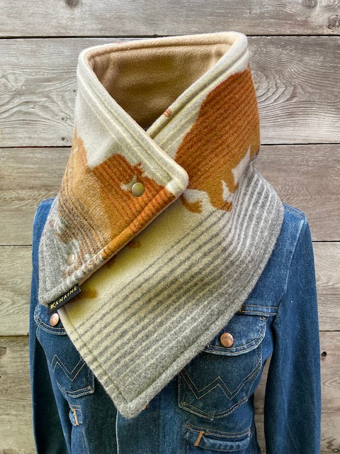 This one-of-a-kind buckaroo cowl is handmade from authentic Pendleton wool blanket in the Roam design. Each buckaroo comes fully lined with super warm luxe fleece or faux sherpa and finished with two heavy western snaps.