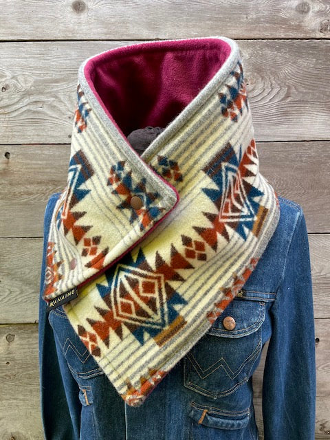 This one-of-a-kind buckaroo cowl is handmade from authentic Pendleton wool blanket in the Roam design. Each buckaroo comes fully lined with super warm luxe fleece or faux sherpa and finished with two heavy western snaps.