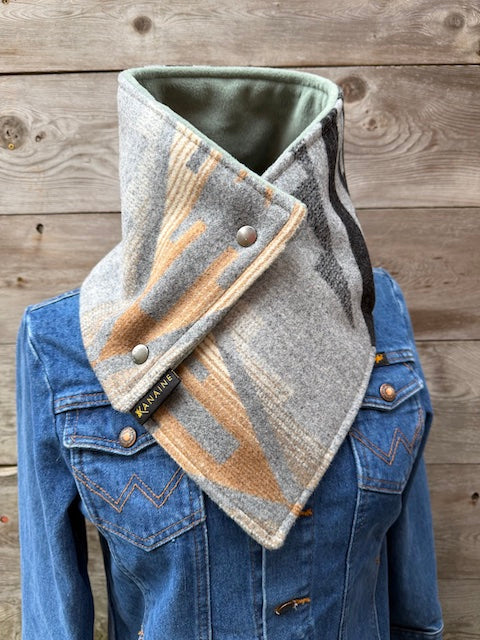 This buckaroo cowl is handmade from authentic Pendleton blanket in the Tumalo Ridge design. Each buckaroo comes fully lined with super warm luxe fleece or faux sherpa and finished with two heavy western snaps.