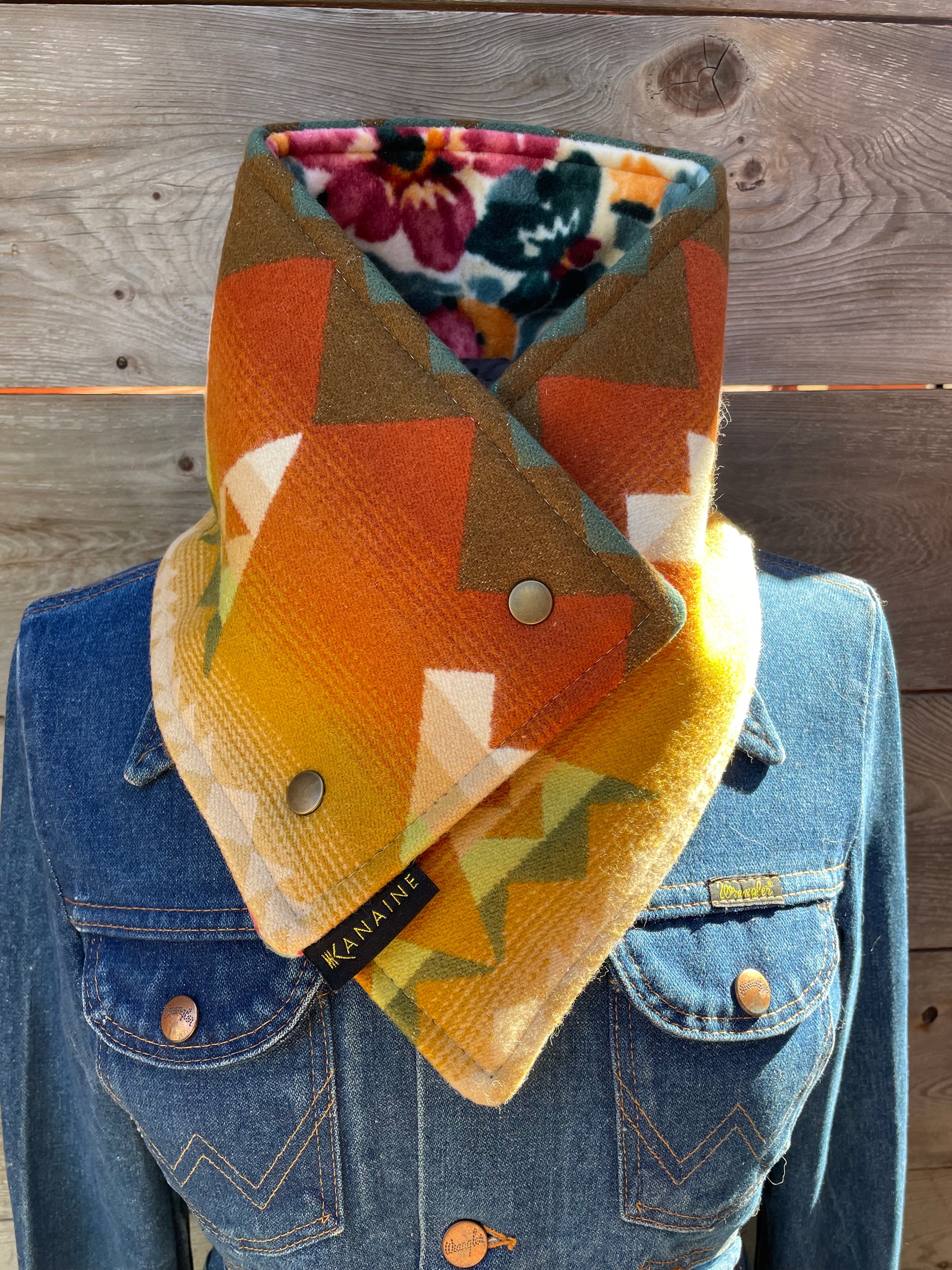 These one-of-a-kind buckaroo cowls are handmade from authentic Pendleton wool blanket in the Solstice Canyon design. Each buckaroo comes fully lined with super warm luxe fleece or faux sherpa and finished with two heavy western snaps.