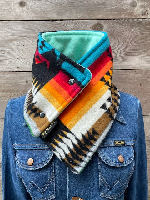 These one-of-a-kind buckaroo cowls are handmade from authentic Pendleton wool blanket in the Chief Joseph design. Each buckaroo comes fully lined with super warm luxe fleece or faux sherpa and finished with two heavy western snaps.