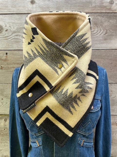 This one-of-a-kind buckaroo cowl is handmade from authentic Pendleton blanket in the natural Harding design. Each buckaroo comes fully lined with super soft faux sherpa or luxe fleece and heavy western snap closures.