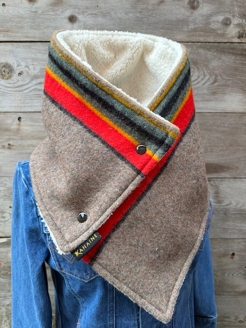 This one-of-a-kind buckaroo cowl is handmade from authentic Pendleton wool blanket in the crowd favorite Yakima Camp design. Each buckaroo comes fully lined with super soft luxe fleece or faux sherpa and finished with two heavy western snaps.
